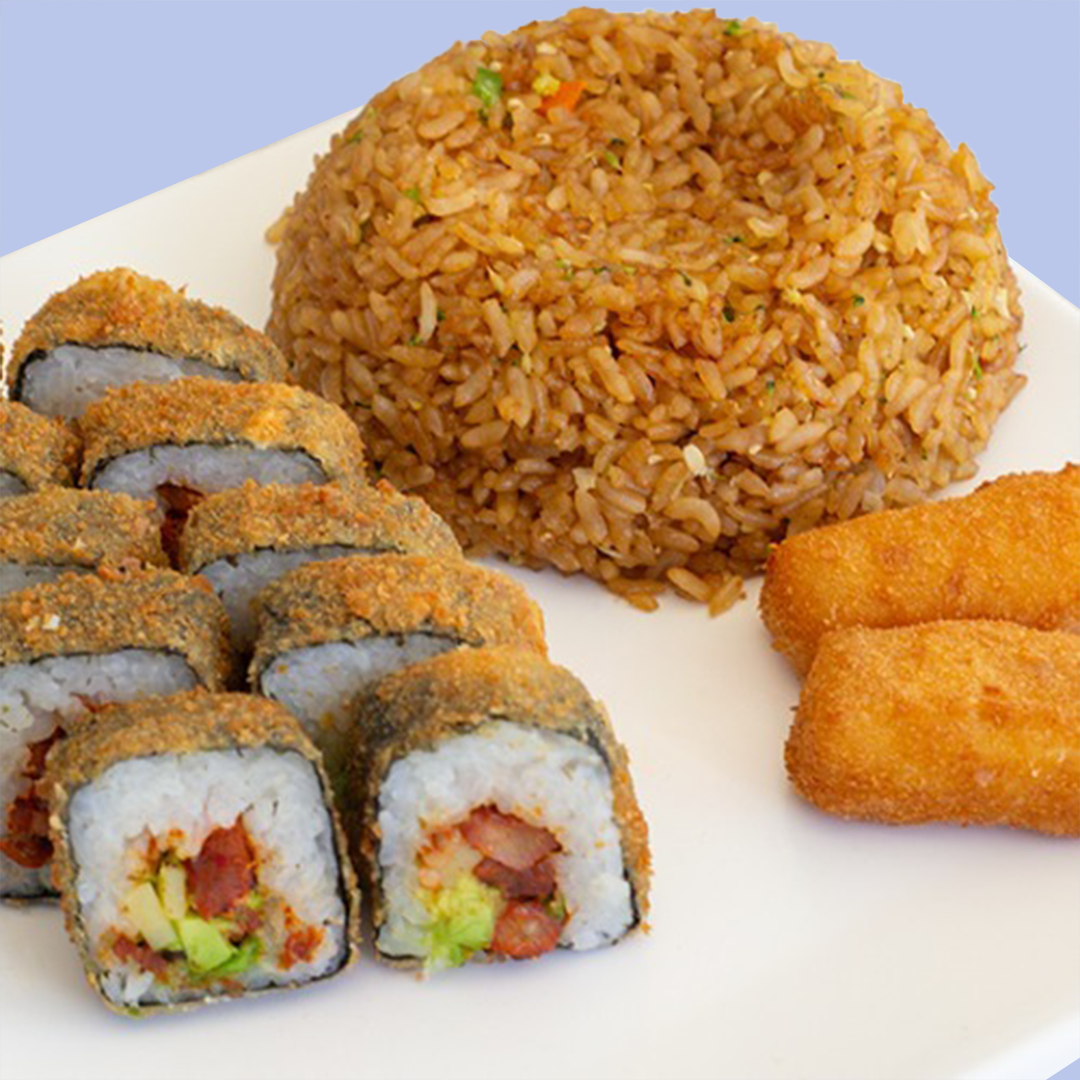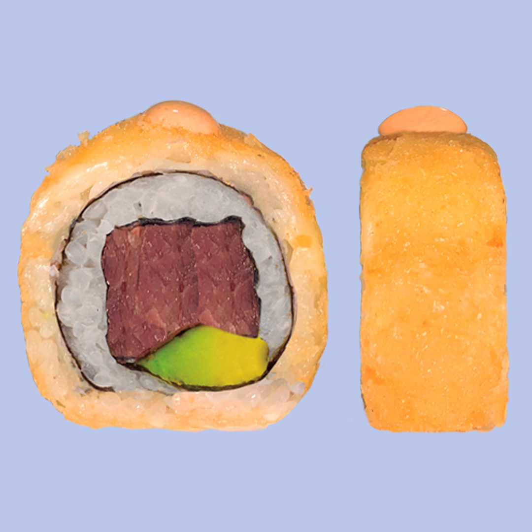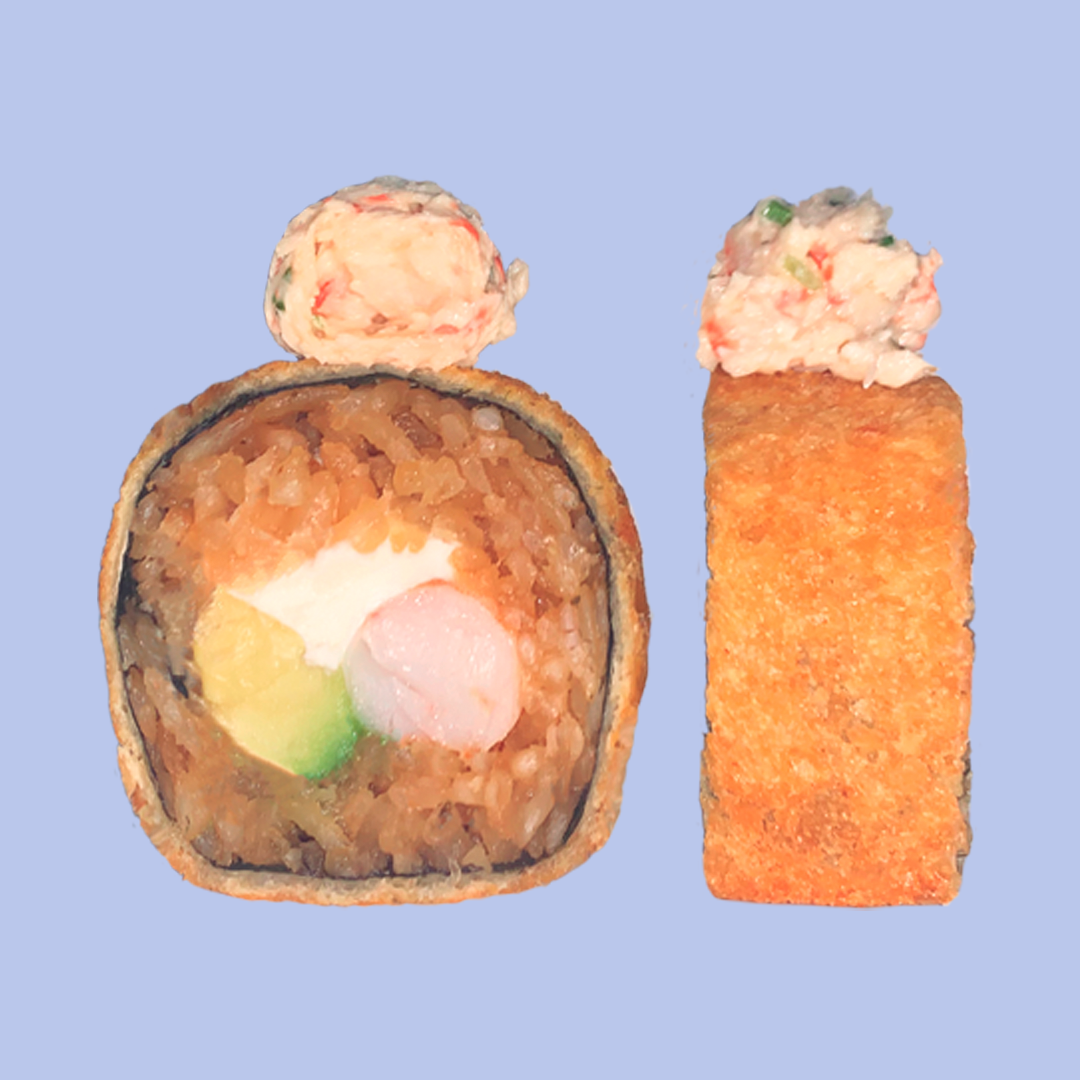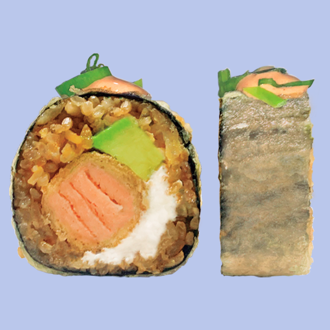 Rollo caliente por dentro: arroz frito, camarón, queso crema y aguacate. por fuera: alga, topping de tampico, va empanizado