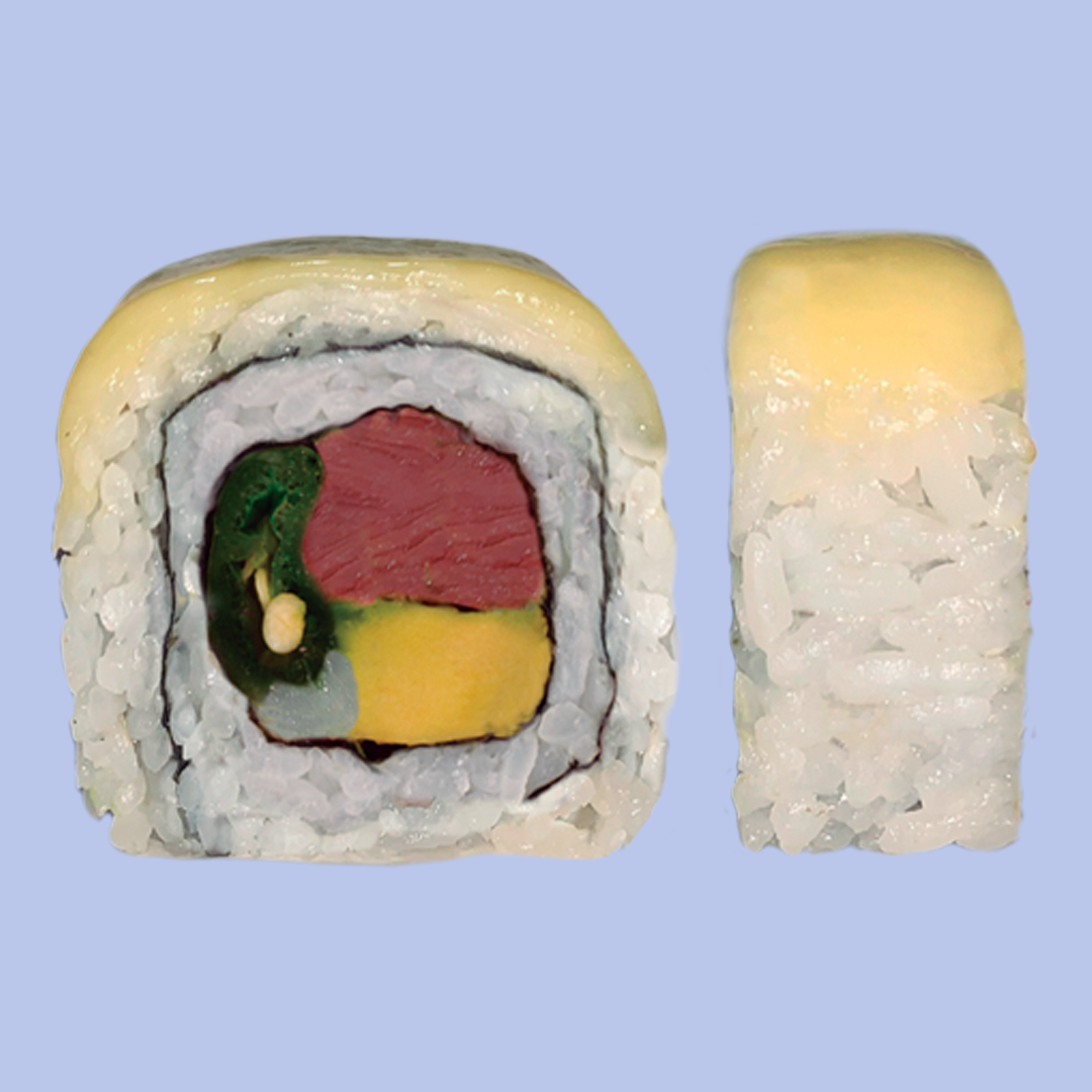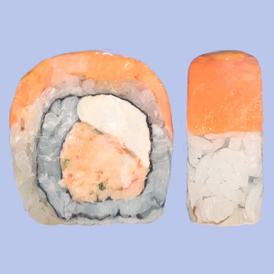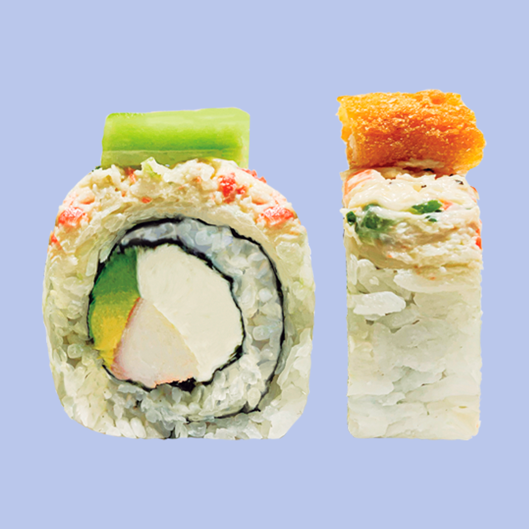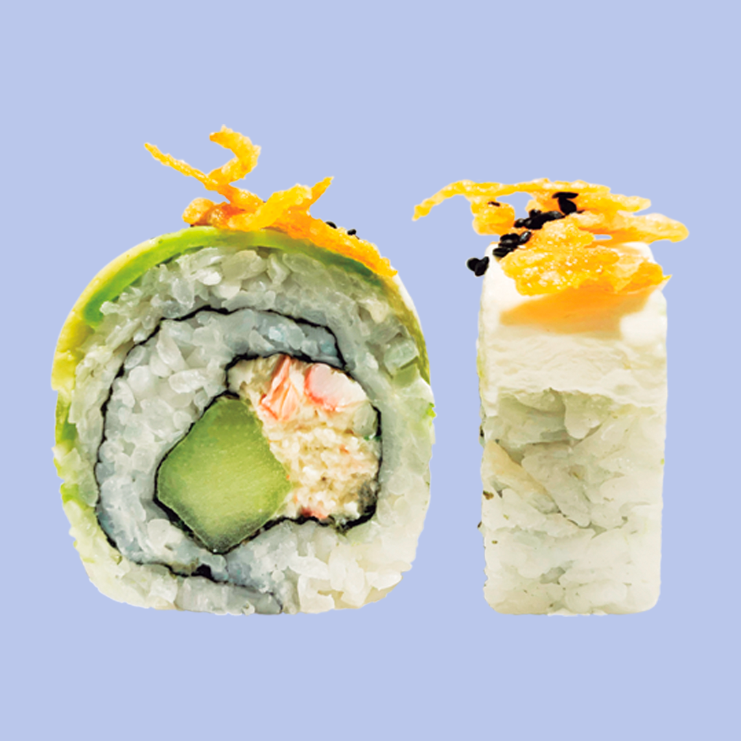 Por dentro: surimi, aguacate y queso crema. por fuera: tampico, camaroncitos crunchy y trocitos de pepino