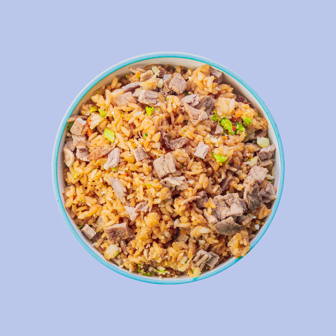 Arroz frito con mix de vegetales, un toque de soya y carne