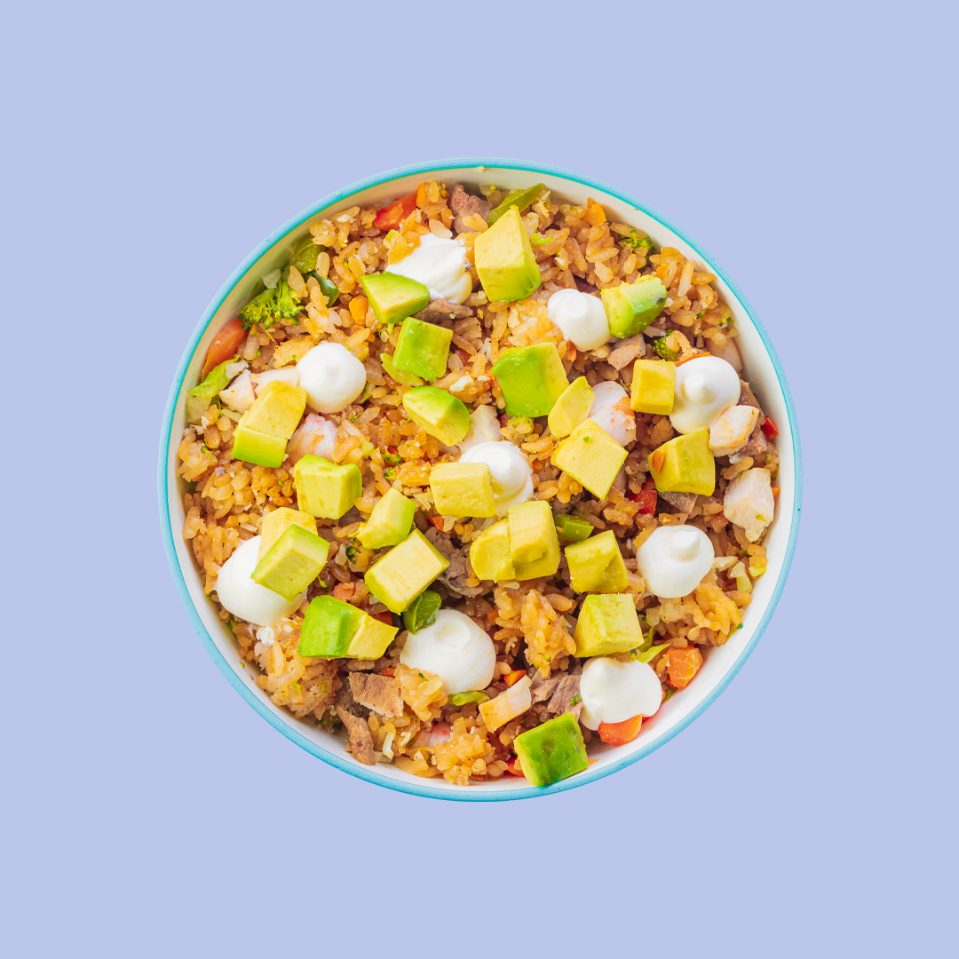 Arroz frito con mix de vegetales, un toque de soya, pollo, camarón, carne, queso crema y aguacate