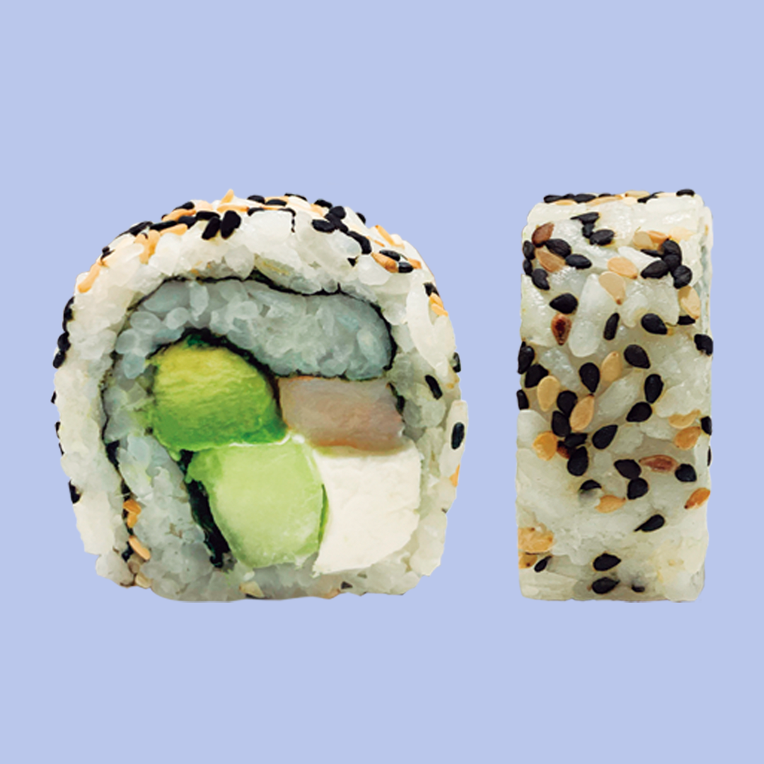 Por dentro: camarón, aguacate, pepino y queso crema. por fuera: ajonjolí blanco y negro