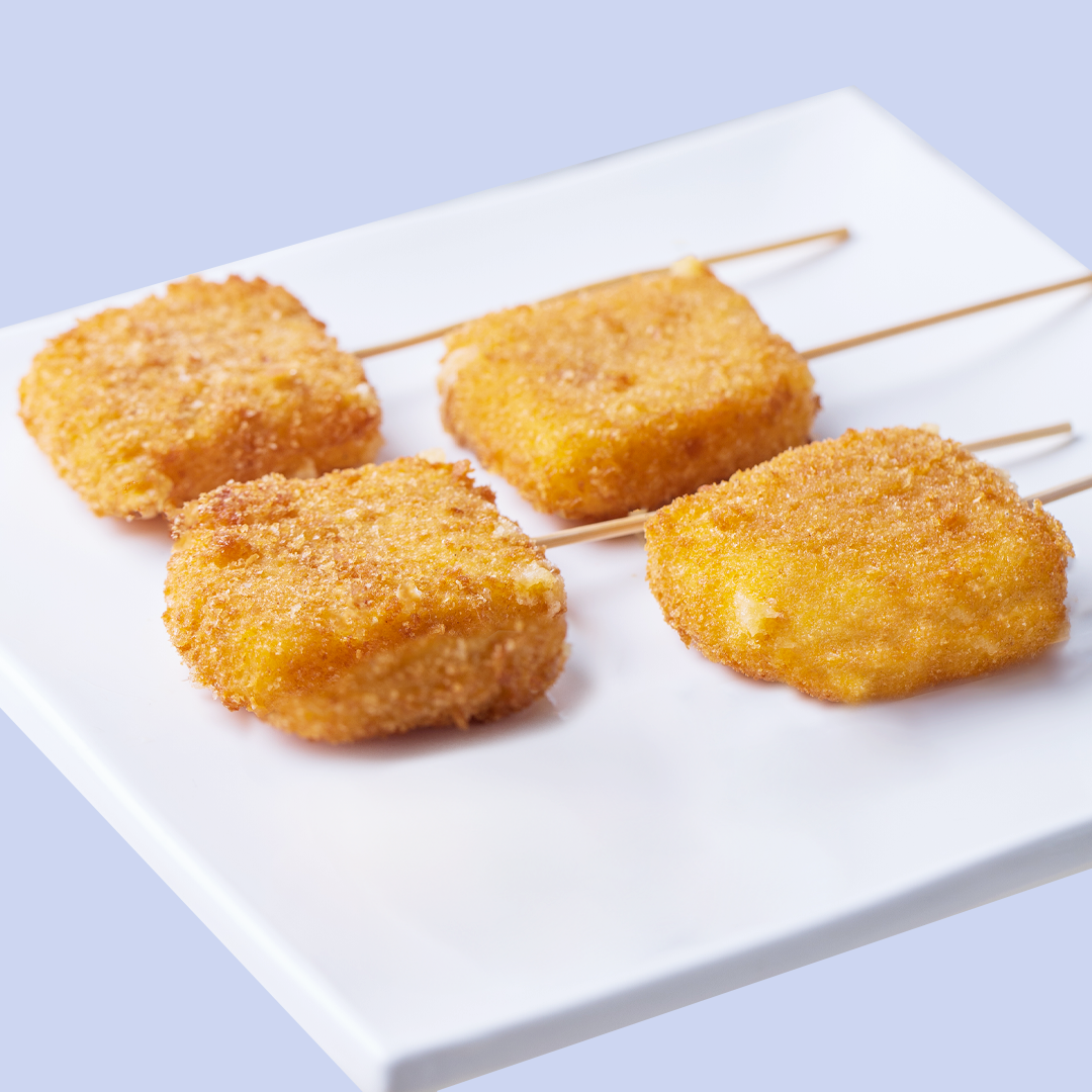 Brochetas de queso manchego empanizados, acompañados de salsa de soya, con o sin picante (chile quebrado)