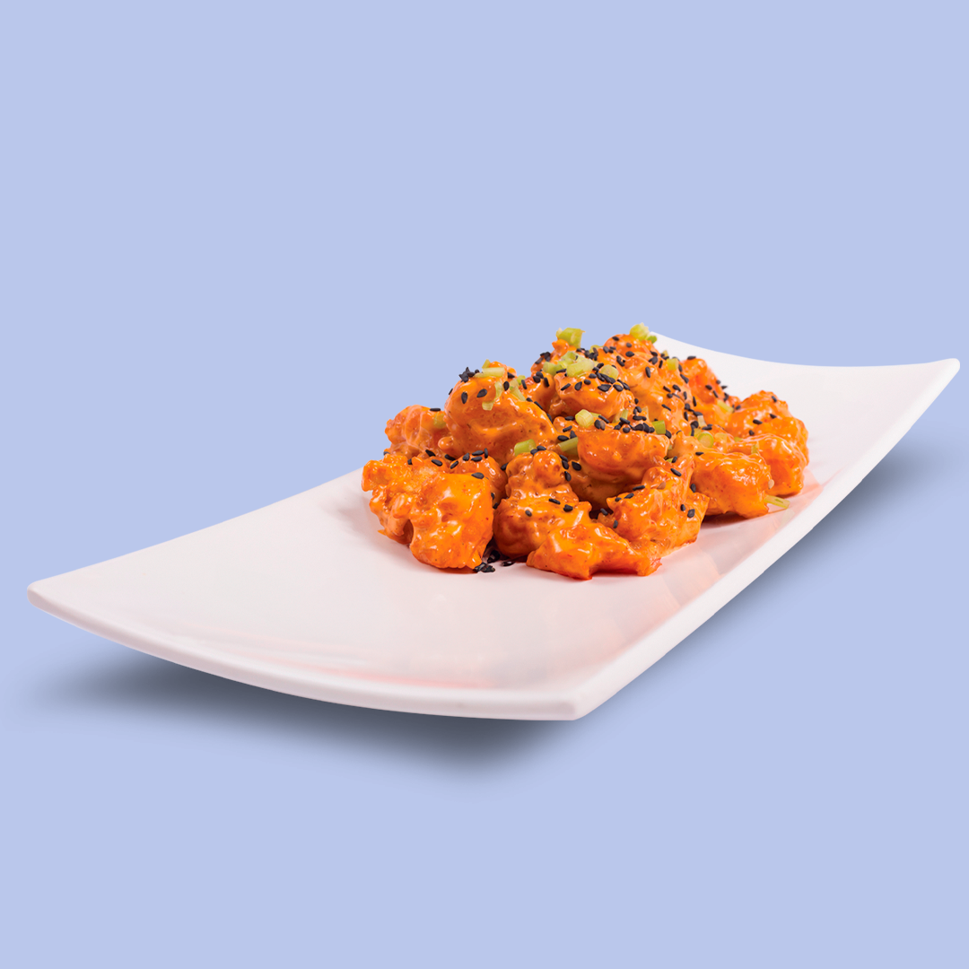 Crujientes bites de camarón con un toque de chipotle, ajonjolí negro y cebollín