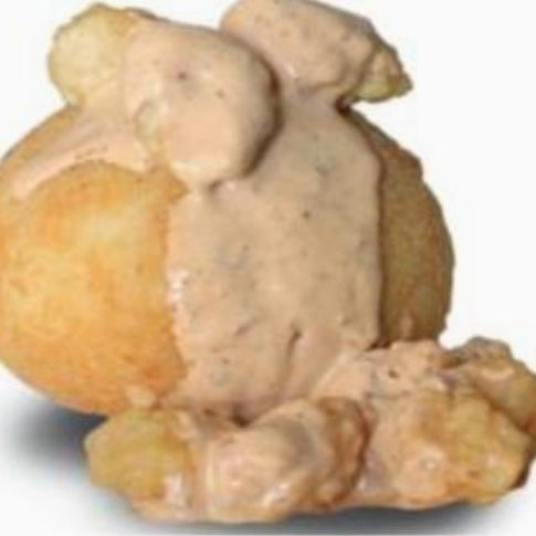 Bolitas de arroz gohan, rellenas de philadelphia van empanizadas acompañadas de tampico y aderezo chipotle.