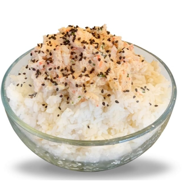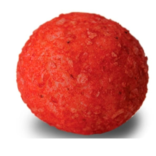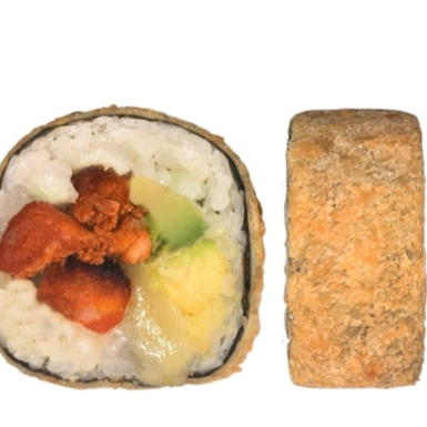 bola de arroz rellena de surimi, philadelphia y aguacate. Por fuera: Takis fuego.