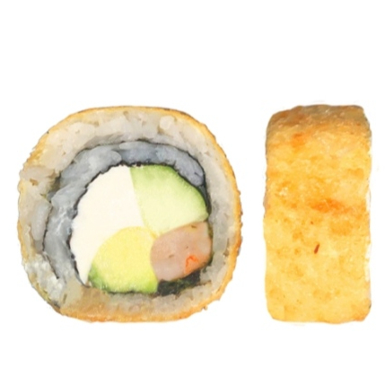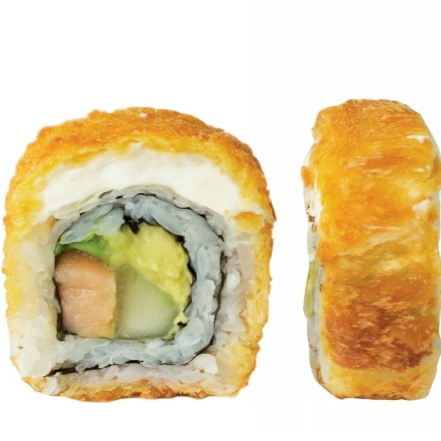 Por dentro: camarón, aguacate y pepino. Por fuera: philadelphia va empanizado.