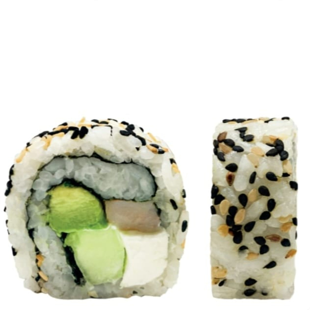 Por dentro: camarón, philadelphia, aguacate y pepino. Por fuera: ajonjolí.