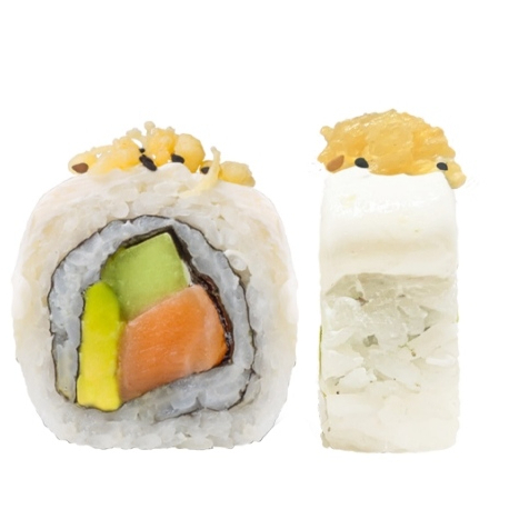 Por dentro: camarón empanizado, philadelphia, pepino y aguacate. Por fuera: tampico y ajonjolí negro.