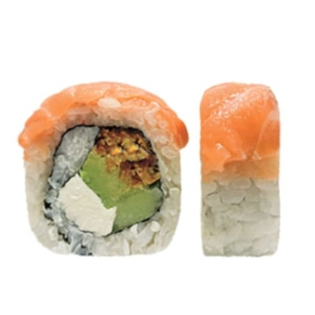 Por dentro: philadelphia, aguacate y pepino. Por fuera: cama de salmón incluye aderezo chipotle.