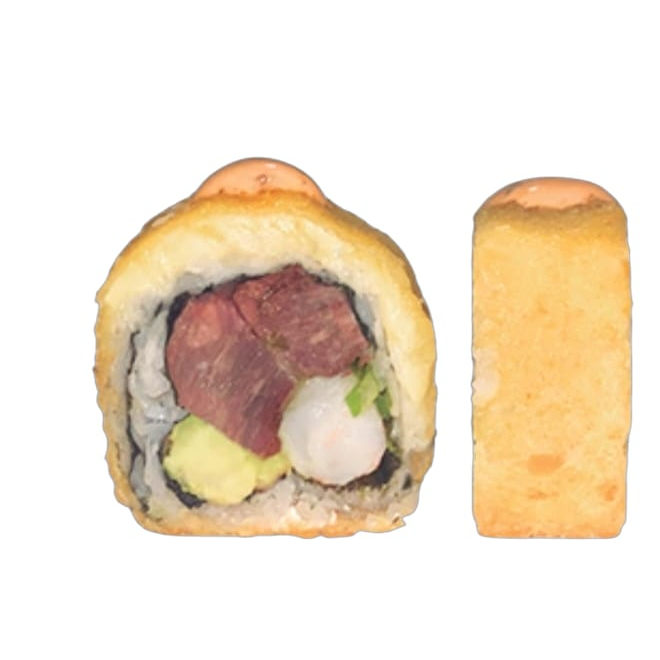 Por dentro: camarón capeado, aguacate y philadelphia. Por fuera: surimi y aderezo chipotle.