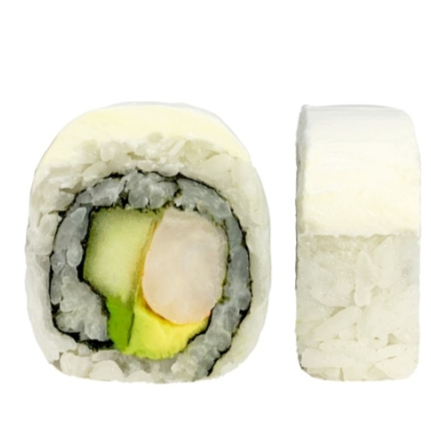 Por dentro: camarón, aguacate y pepino. Por fuera: philadelphia.