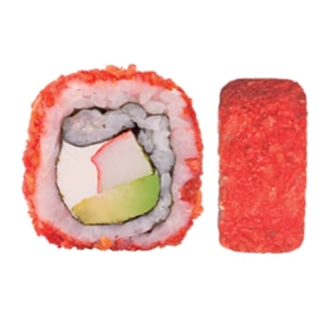 Por dentro: surimi, philadelphia y aguacate. Por fuera: Takis fuego.