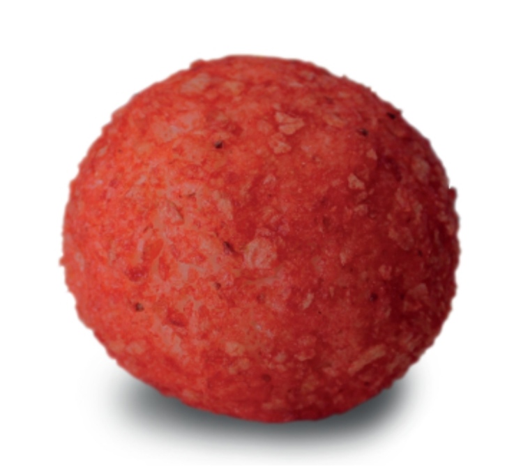 Bola de arroz rellena de camarón, philadelphia y aguacate. Por fuera: Cheetos Flaming Hot.
