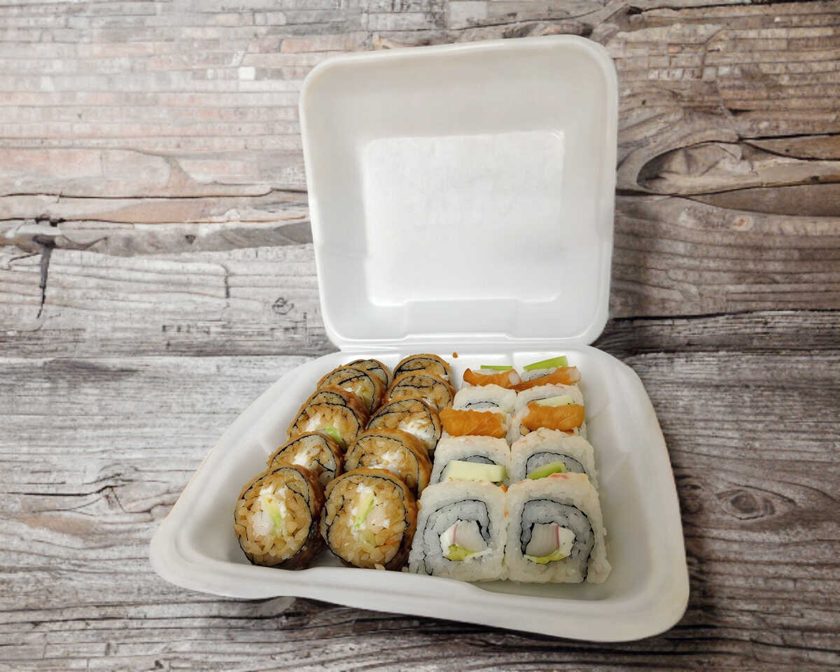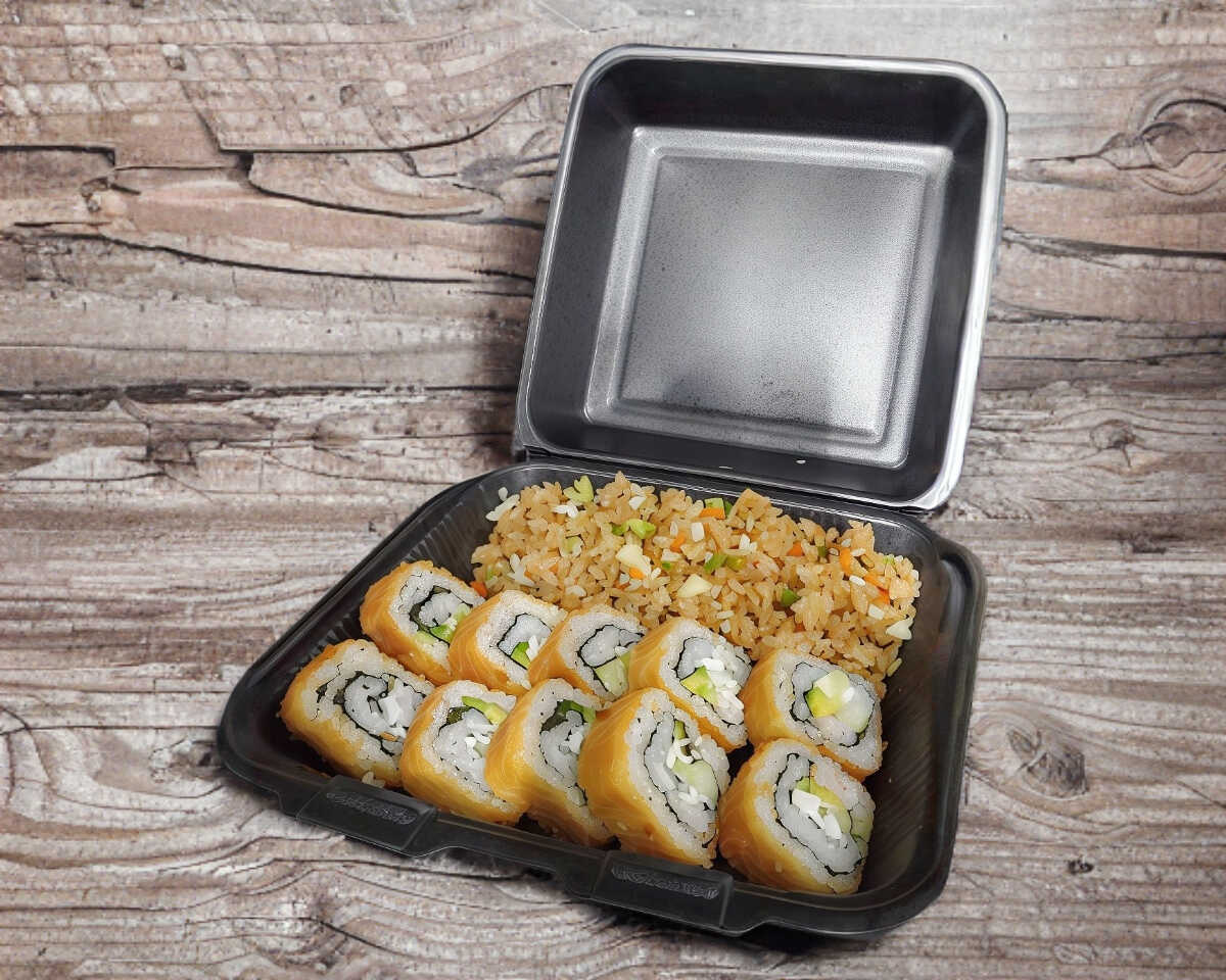 1 Sushi a elegir, acompañado de una porción de arroz con vegetales y 1 refresco.