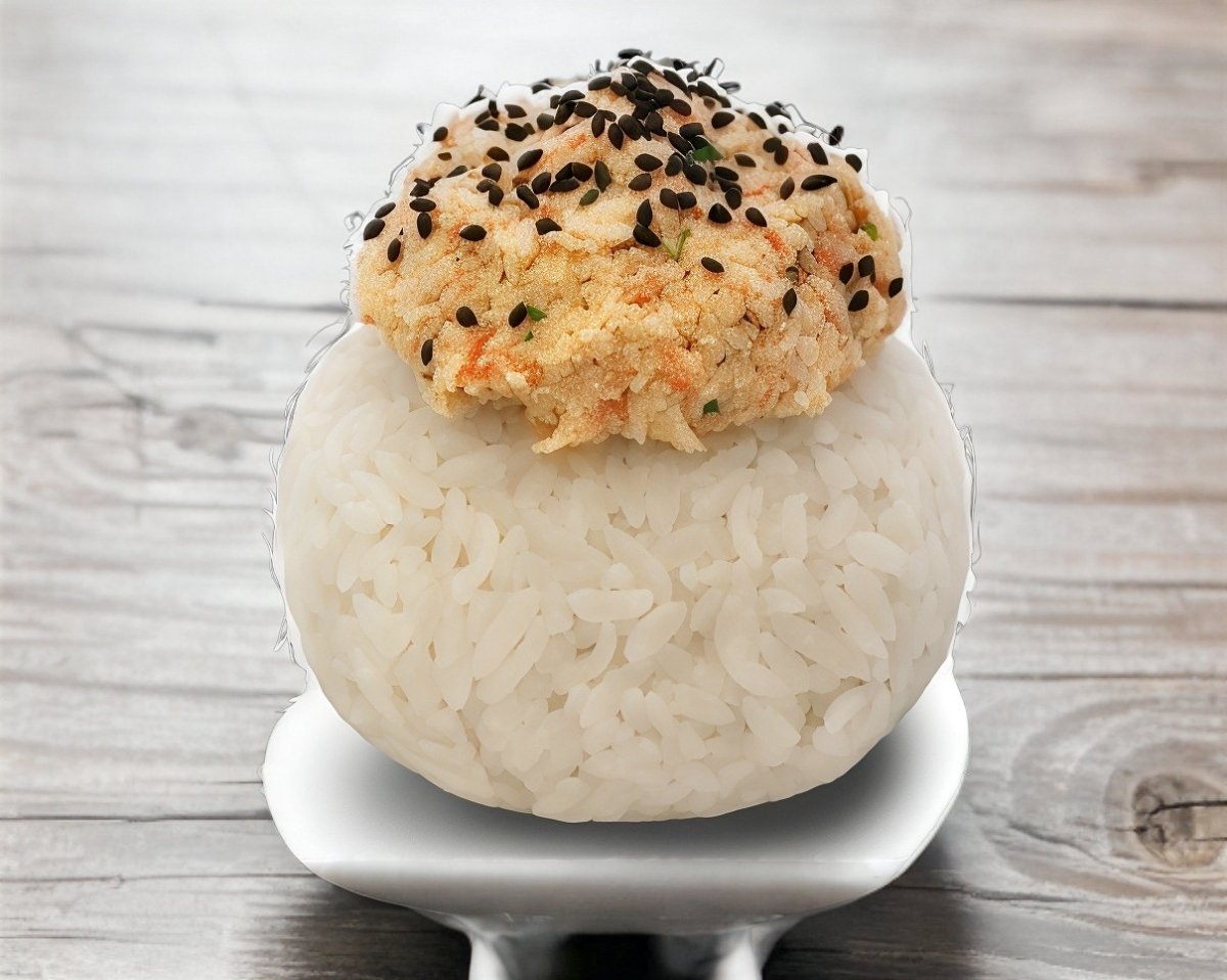 Arroz al vapor, ajonjolí negro y tampico.