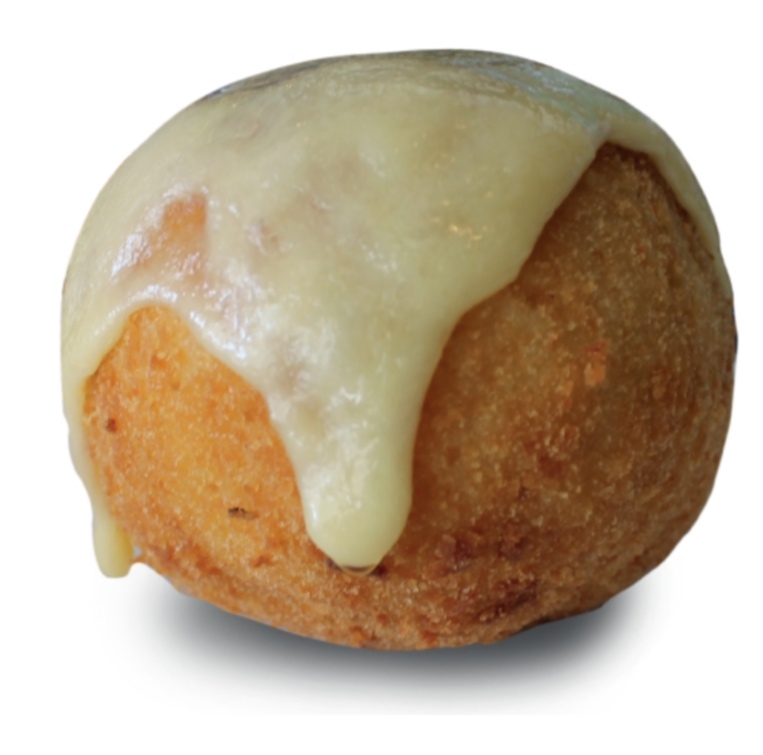 Bola de arroz rellena de carne de pastor, arrachera y aguacate. Por fuera: empanizada y queso manchego.