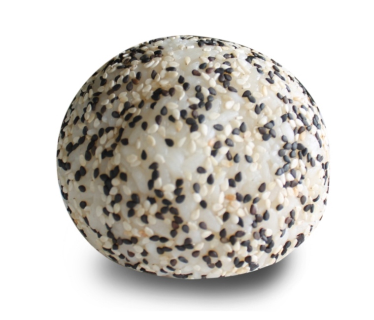 Bola de arroz rellena de camarón, pepino, philadelphia y aguacate. Por fuera: ajonjolí.