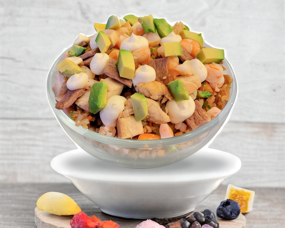 Arroz frito, mix de vegetales, pollo, carne de res, camarón, philadelphia y aguacate.