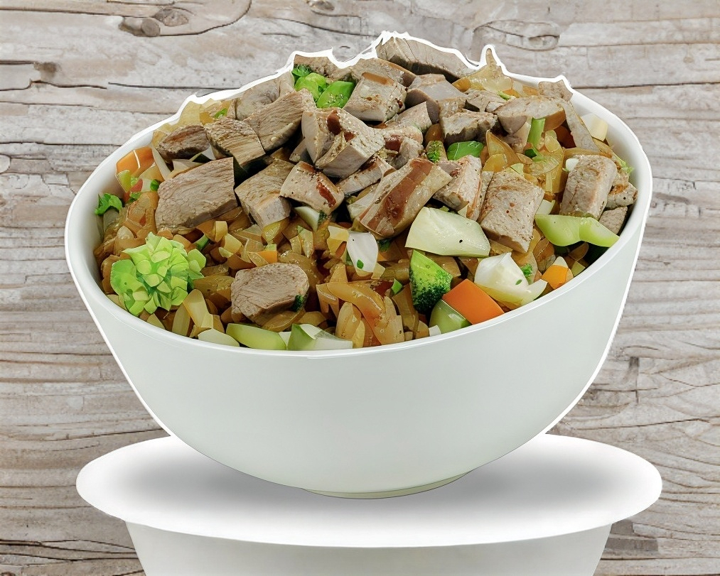 Arroz frito, mix de vegetales y carne de res.