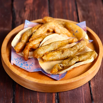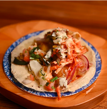 Taco con doble tortilla de maíz, camarón capeado, queso chihuahua, chile caribe y philadelphia.
