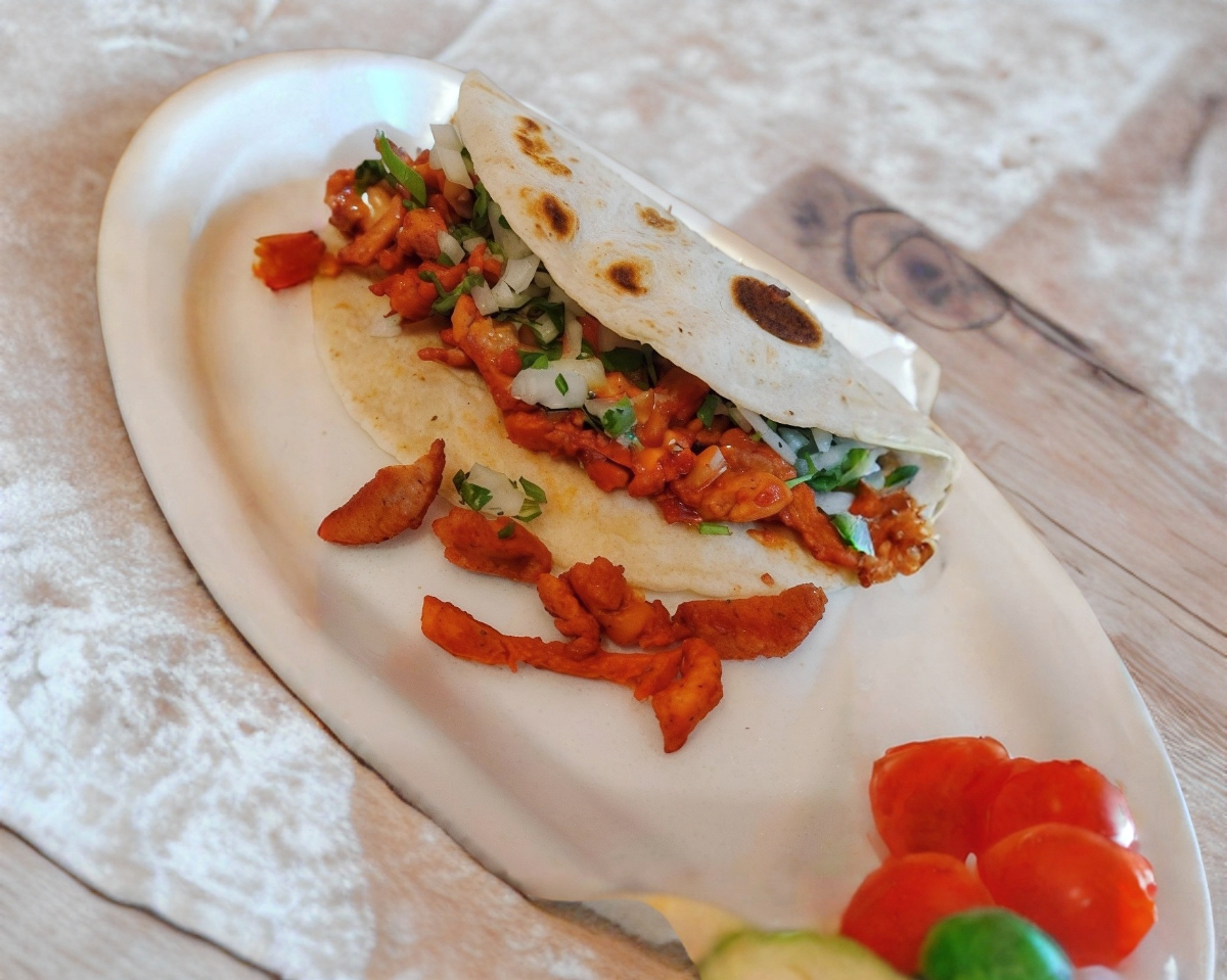 Tortilla grande con su carne de trompo con la receta de la casa con queso y cebolla asada.
