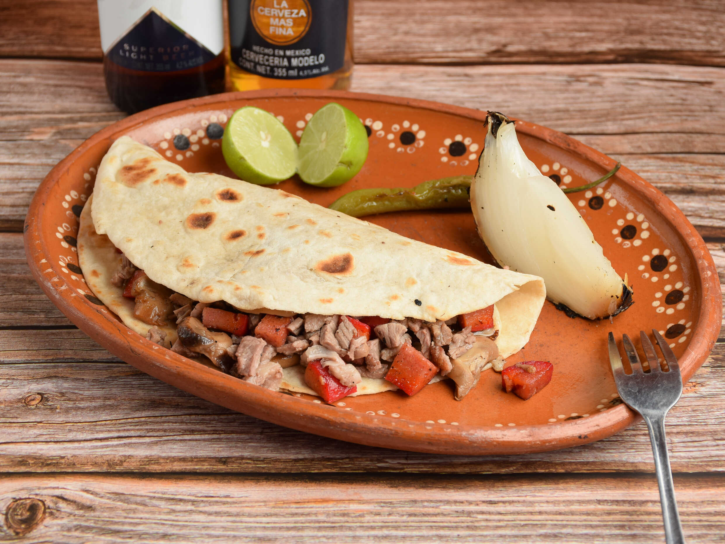 1 Kg de costilla carrillera, 2 refrescos, 4 salchichas, cebolla asada, chiles toreados, salsas y tortillas.