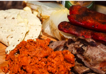 Tortillas de harina de burro, queso asadero, salchicha para asar, champiñones, sirloin asado y picado a las brasas.