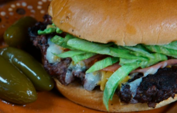 Pan de hamburguesa, mayonesa, aguacate, carne de sirloin molido a las brasas, queso asadero, queso amarillo, jamón, lechuga.
