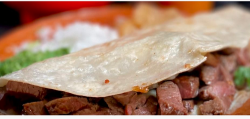 Tortillas de harina de burro, queso asadero, queso amarillo sirloin asado y picado a las brasas.