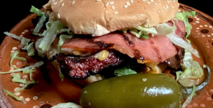 Pan de hamburguesa, mayonesa, carne de sirloin molido a las brasas, queso asadero, queso amarillo, jamón, lechuga, salsa BBQ.