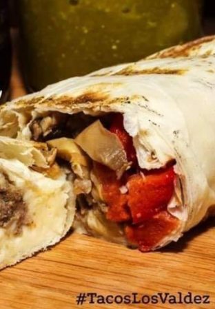 Tortillas de harina de burro,queso asadero,salchicha para asar, champiñones,sirloin asado y picado alas brasas.