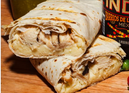 Tortillas de harina de burro,queso asadero, pollo asado a las brasas.