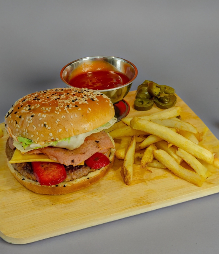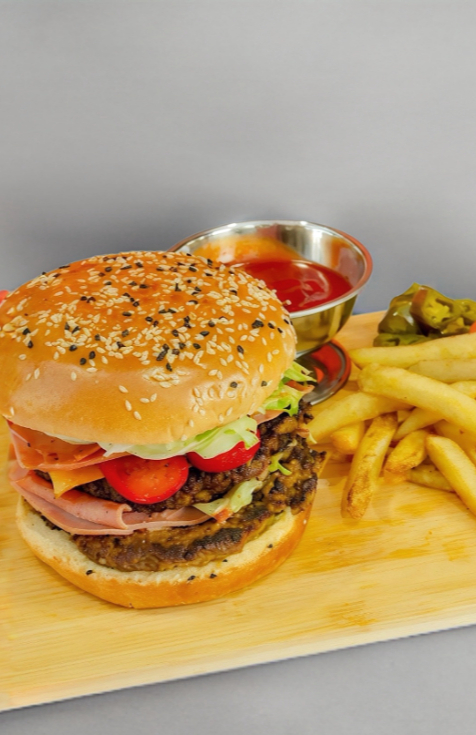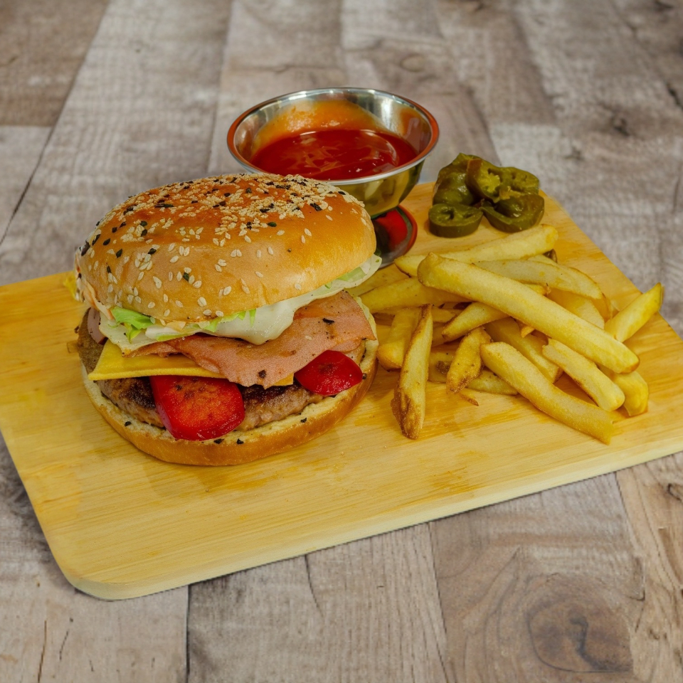 Hamburguesa al carbón con doble carne 100% casera, (mayonesa, catsup, lechuga, aguacate, doble queso amarillo, salchicha para asar, jamon,) Incluye Papas a la Francesa.