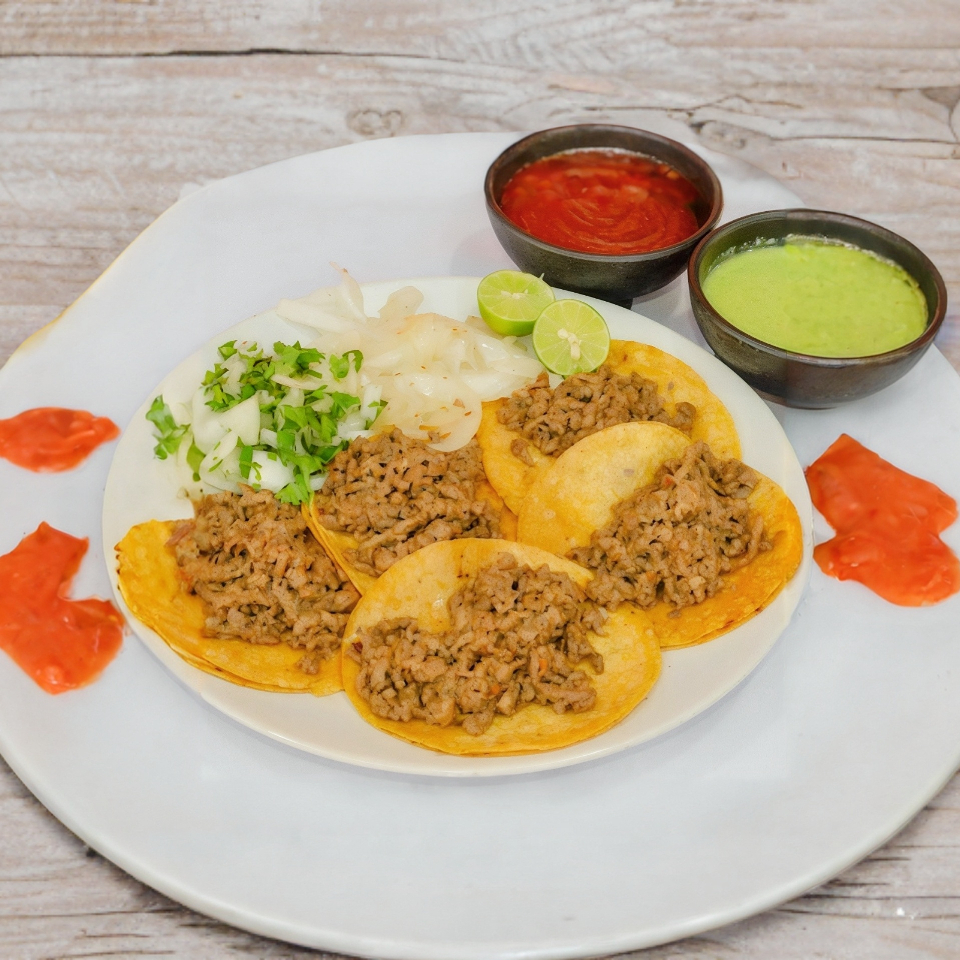 5 Tacos de bistec en tortilla a elegir con salsas de la casa, cebolla con cilantro y cebolla asada.