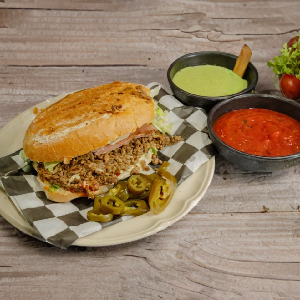 Torta de Bistec con queso, (jamón, mayonesa, cátsup, lechuga, aguacate)