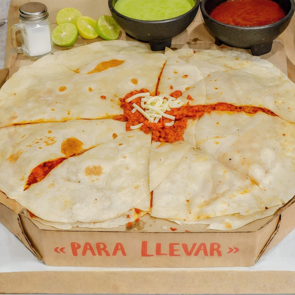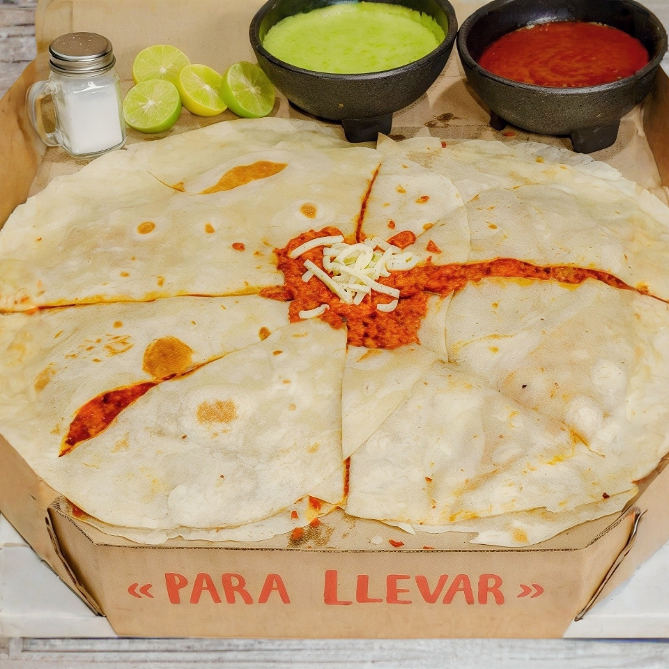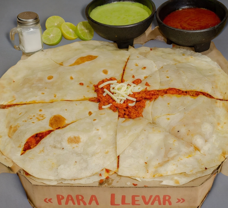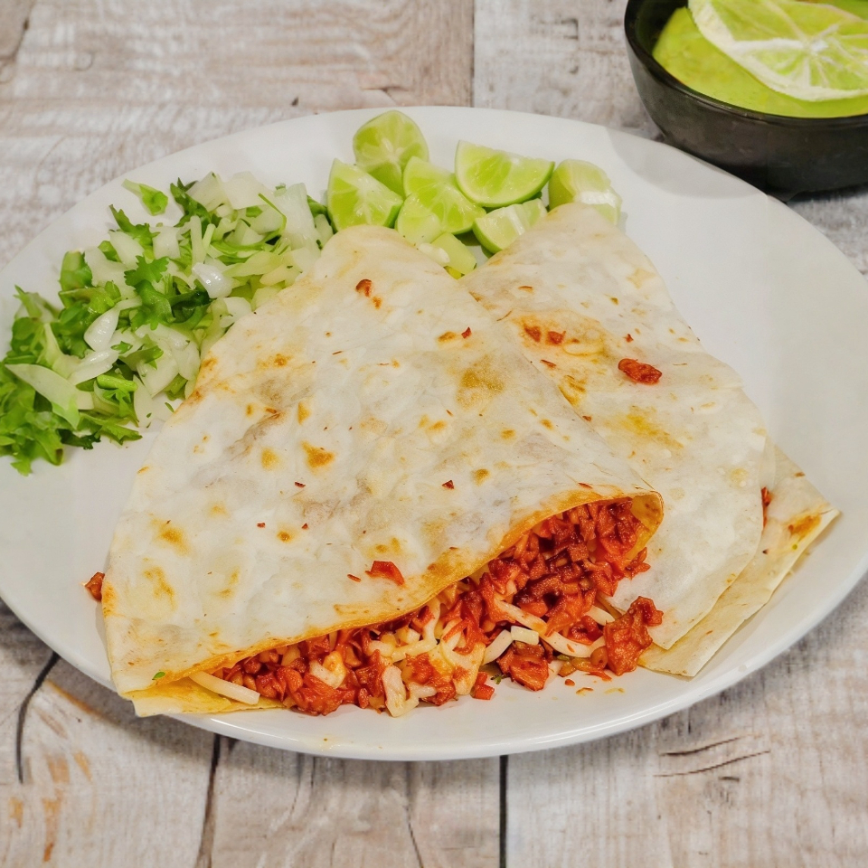 Tortilla de burrito con pastor con queso por dentro partida por la mitad.