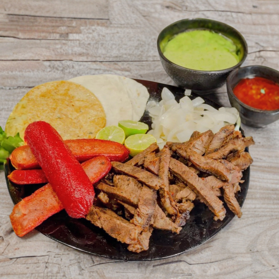 1kg de Carne Asada con 2 Salchichas asadas, 100 gr tortillas harina y maíz, Salsa de la casa, cebolla asada y limones.