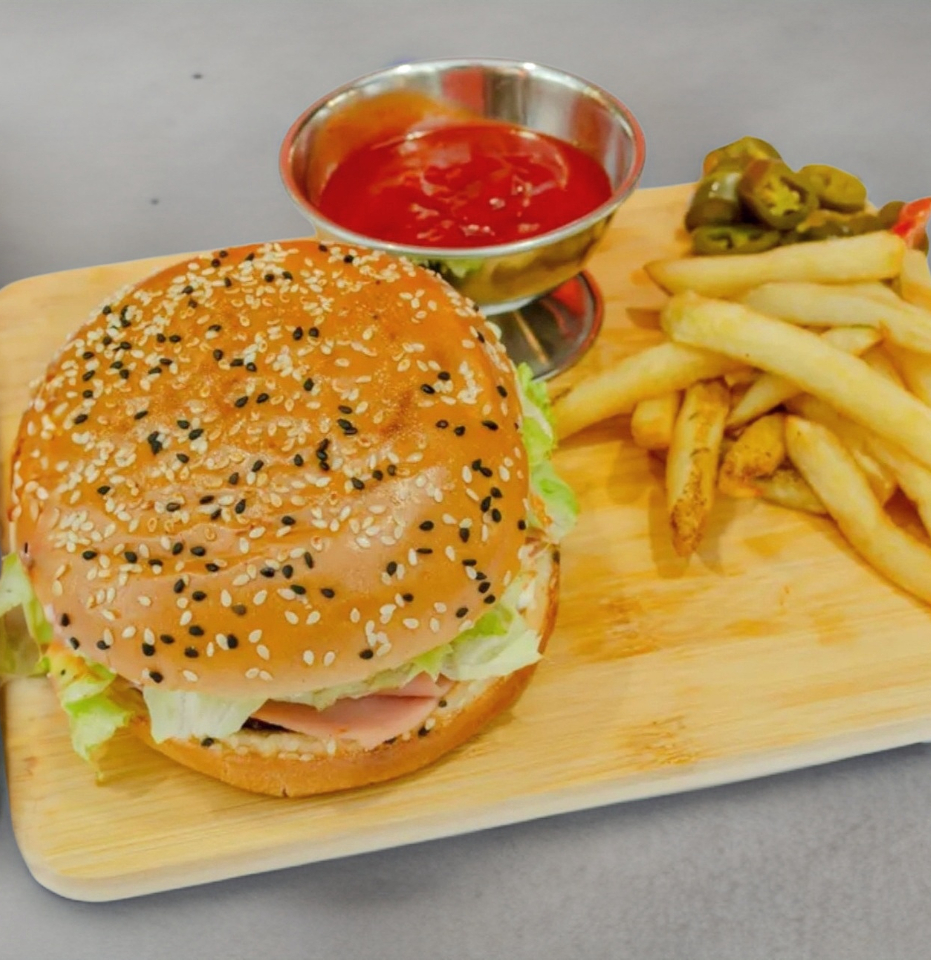 Hamburguesa al carbon con carne 100% casera, (mayonesa, catsup, lechuga, aguacate, jamon, queso amarillo,) Incluye porción de Papas a la Francesa