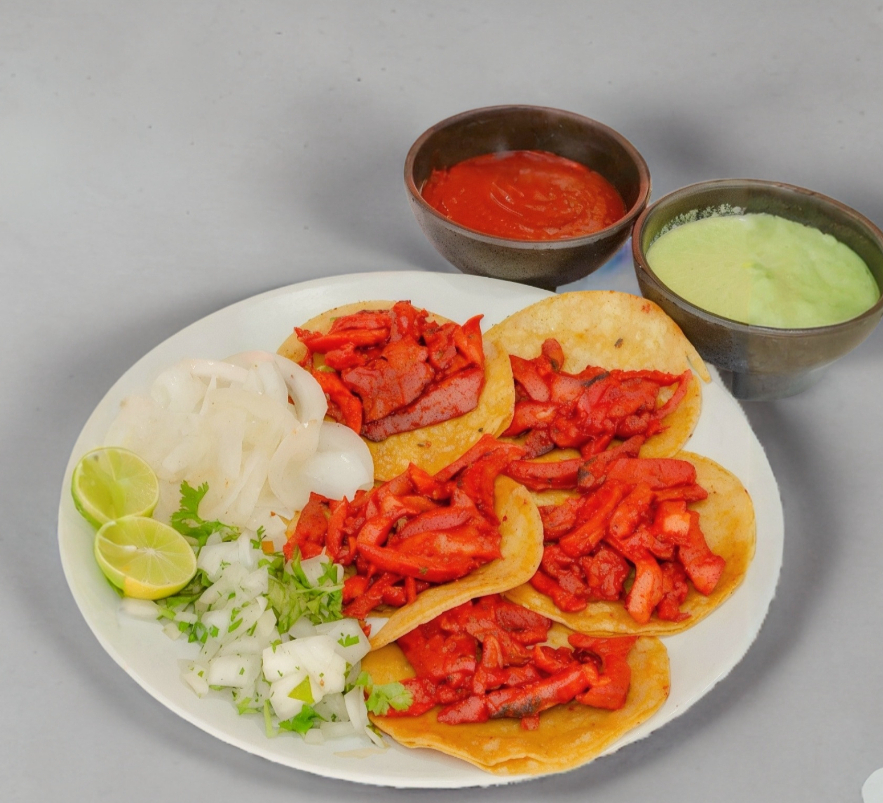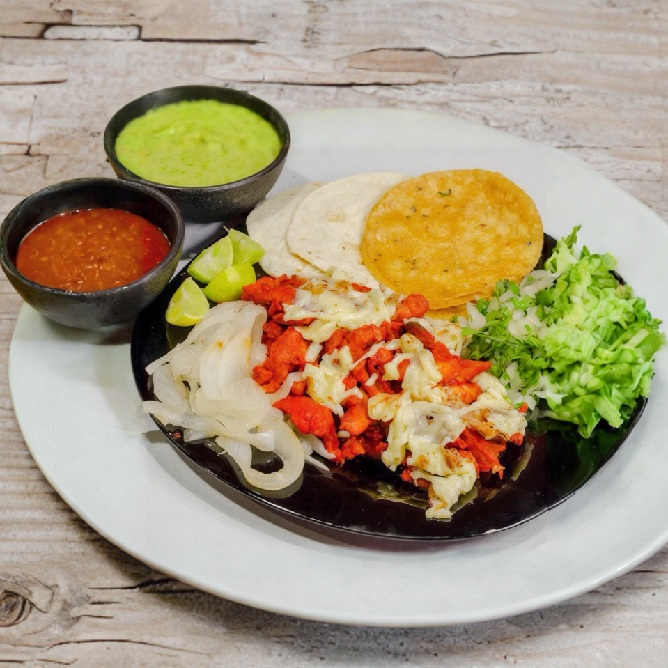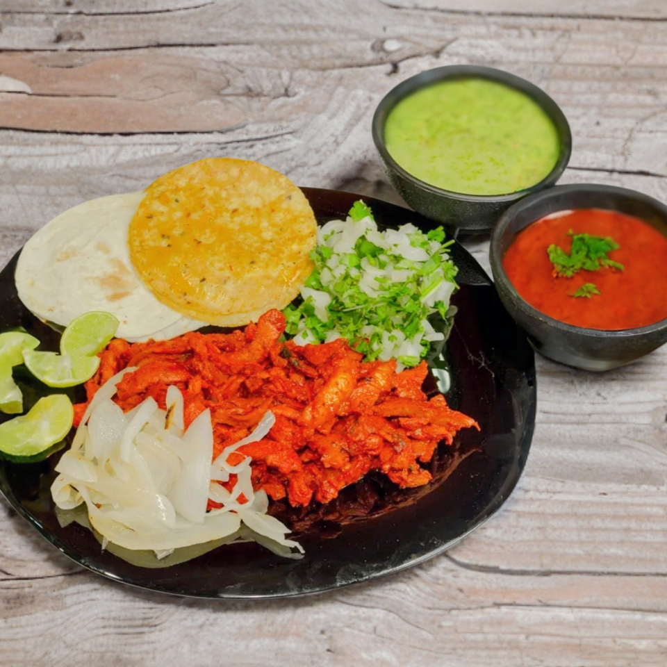 1 Kg de Pastor con salsas de la casa, 100 gr de tortillas harina y maiz, cebolla asada, cebolla con cilantro y limones