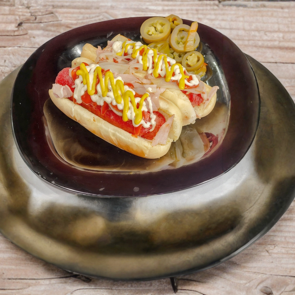 Hot Dog de salchicha para Asar Jumbo, con cebolla asada y tocino, (mayonesa y catsup) Incluye Papas a la Francesa.