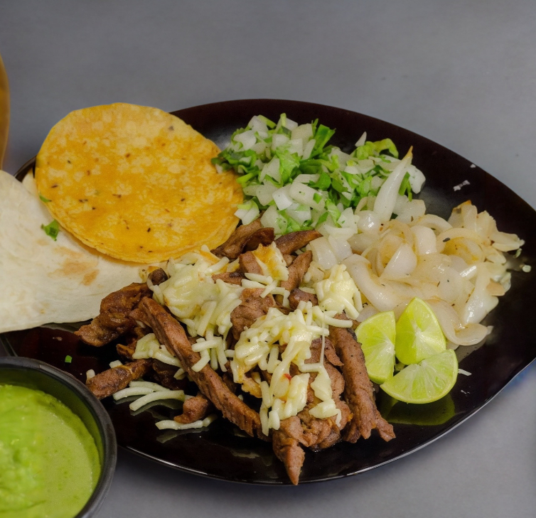 250 gr de bistec con queso, acompañados de cebolla asada, salsa de la casa, limones, tortillas de maiz y harina.