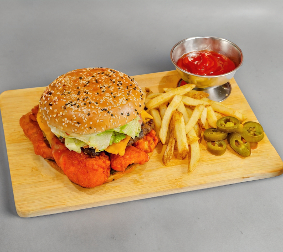 Hamburguesa con carne 100% al carbon, y boneless bañados en salsa Bufalo, (mayonesa, catsup, lechuga, aguacate, queso amarillo, jamon,) Incluye porcion de Papas a la francesa