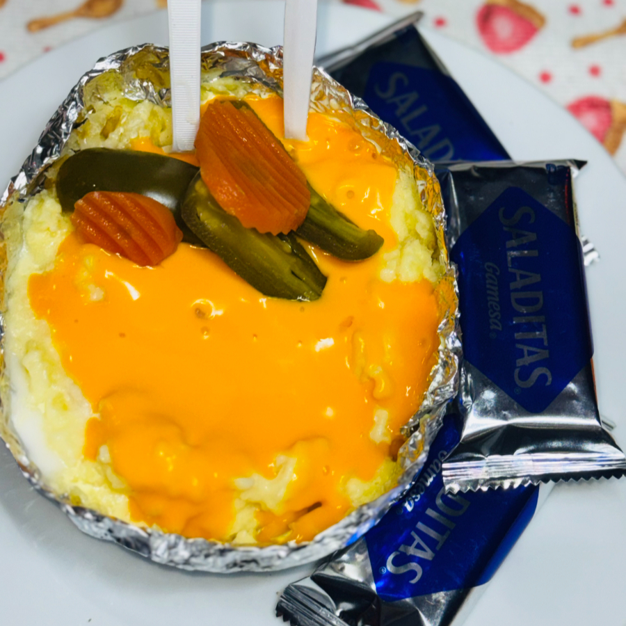PAPA ASADA GRANDE AL CARBON PARA DOS PERSONAS INCLUYE MANTEQUILLA CREMA QUESO AMARILLO GRATINADO GALLETAS SALADAS SALSAS VERDE Y ROJA