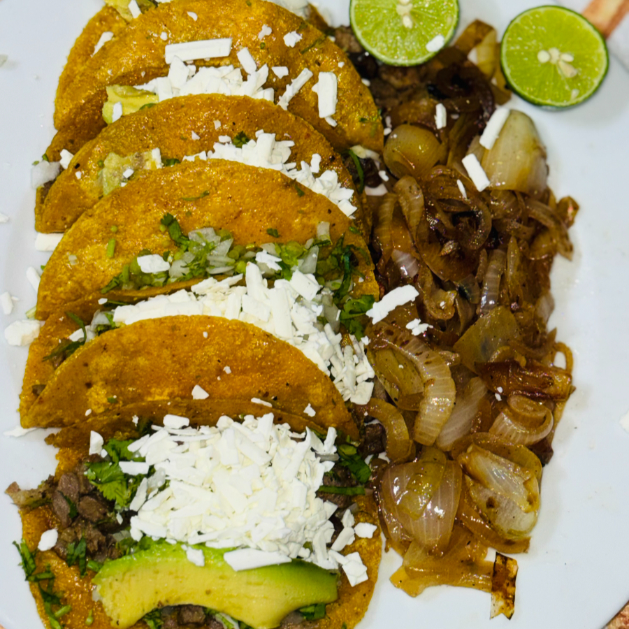 ORDEN CON 5 TACOS CON CARNE DE RES AGUACATE Y QUESO INCLUYE CEBOLLA ASADA , CEBOLLA Y CILANTRO LIMON SALSAS VERDE Y ROJA