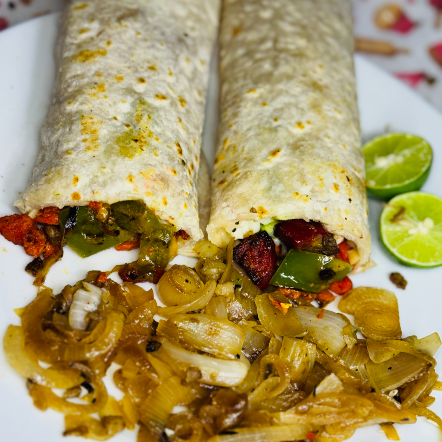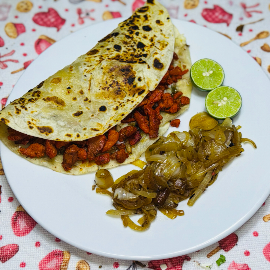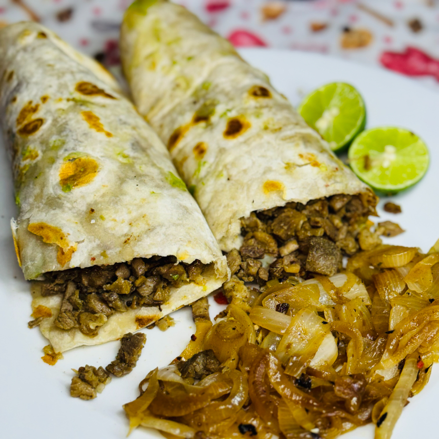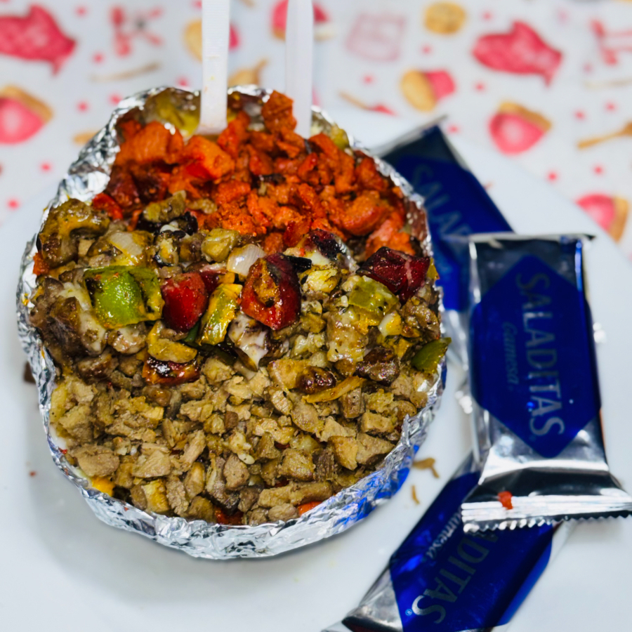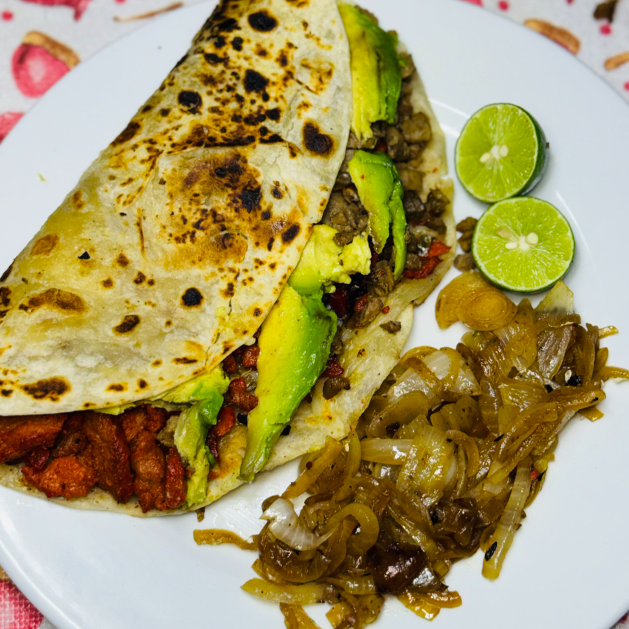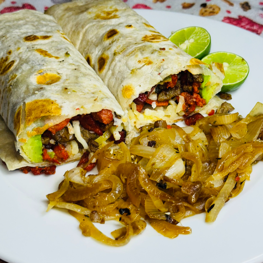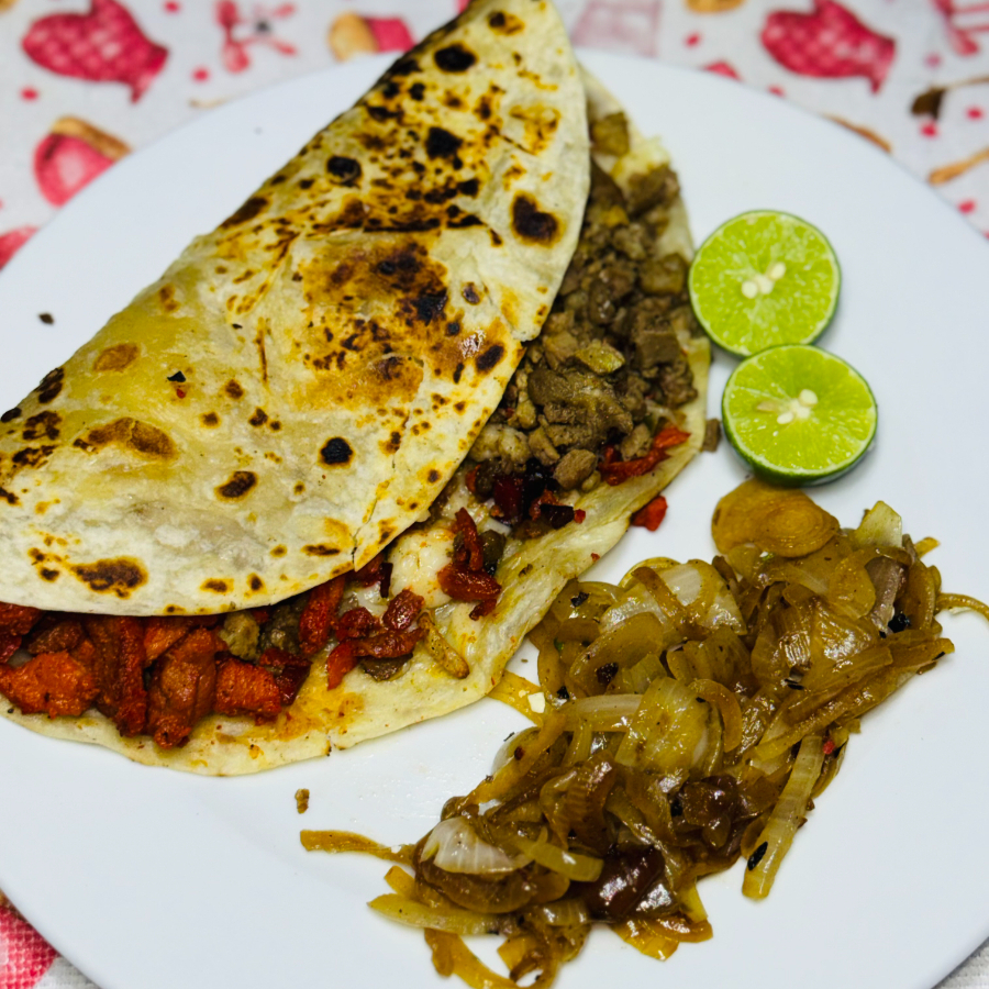 TORTILLA DE HARINA GIGANTE CON PASTOR Y BISTEK INCLUYE QUESO CHIHUAHUA AGUACATE CEBOLLA ASADA LIMON Y SALSAS VERDE Y ROJA