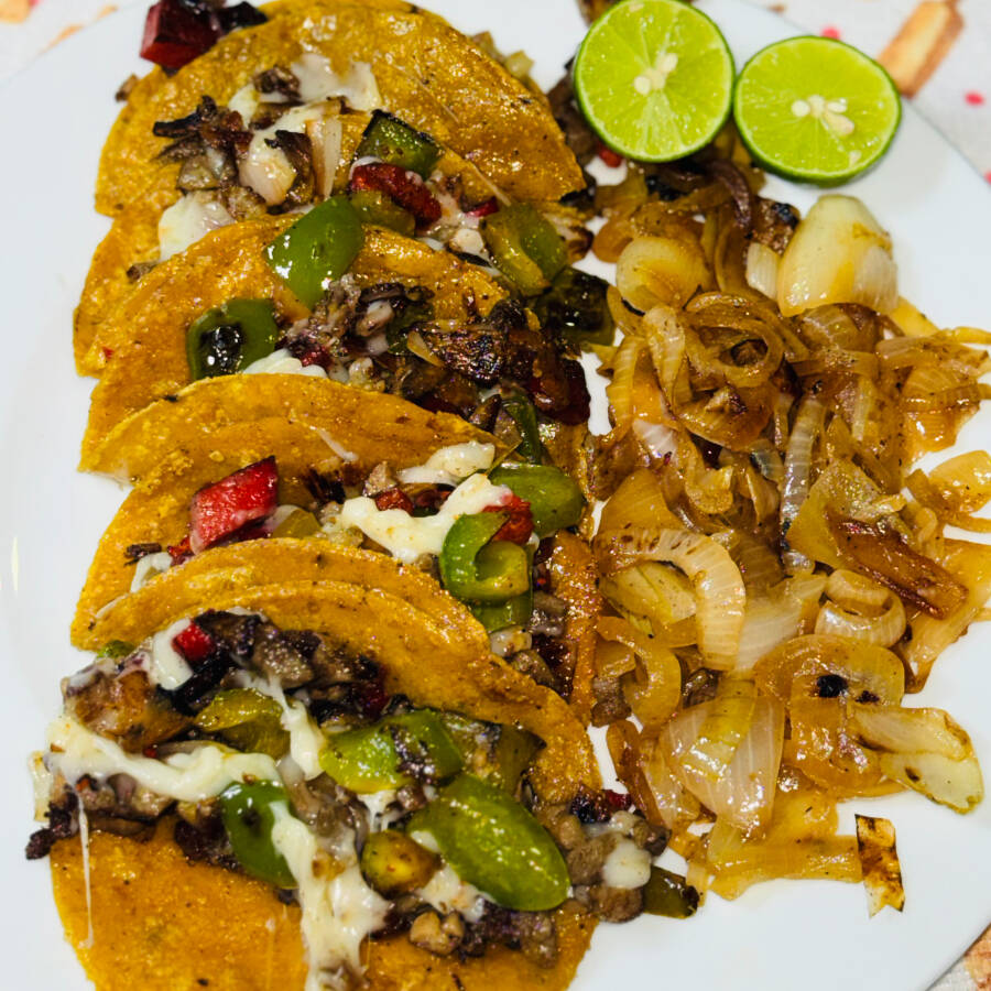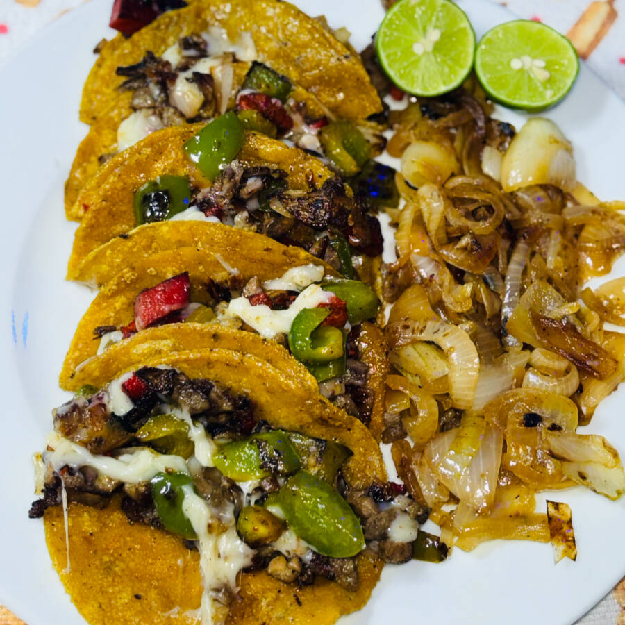 ORDEN CON 5 TACOS GRATINADOS CON QUESO CHIHUAHUA INCLUYE CEBOLLA CHILE MORRON SALCHICHA ASADA TOCINO CEBOLLA ASADA LIMON Y SALSAS VERDE Y ROJA