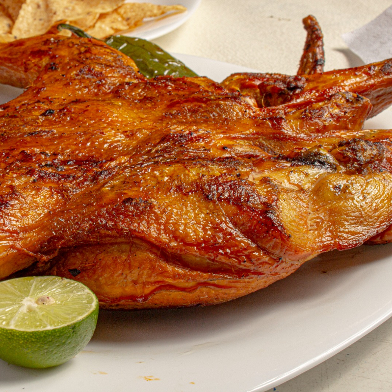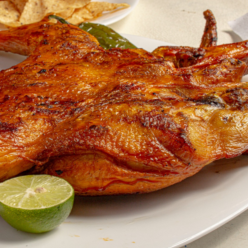 1 POLLO ASADO AL CARBON (8PZAS) INCLUYE 1 SALCHICHA ASADA CEBOLLA ASADA LIMON TOTOPOS CHILE TOREADO SALSAS VERDE Y ROJA