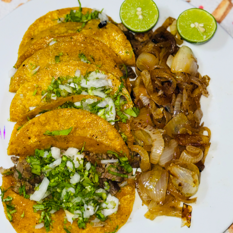 ORDEN CON 5 TACOS, CEBOLLA ASADA Y CEBOLLA Y CILANTRO INCLUYE SALSA VERDE SALSA ROJA LIMON