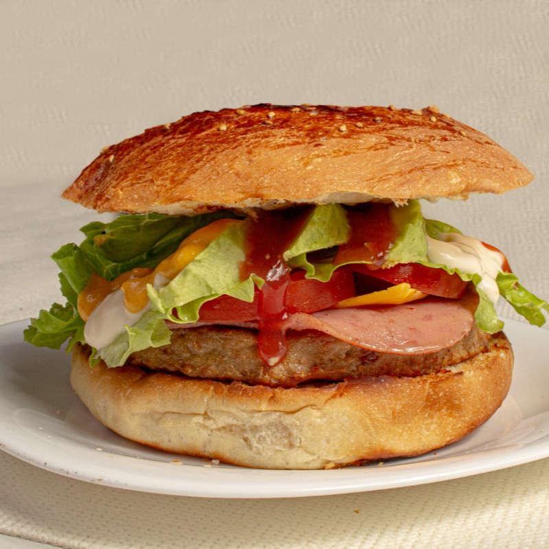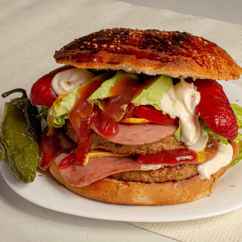 PAN CARNE DOBLE DE SIRLOIN Y SALCHICHA ASADA INCLUYE PAPAS ALA FRANCESA JAMON QUESO AMARILLO LECHUGA TOMATE CATSUP MAYONES MOSTAZA CHILES EN VINAGRE