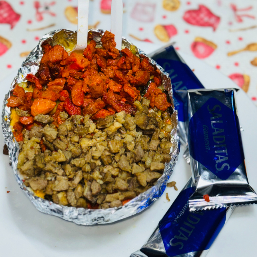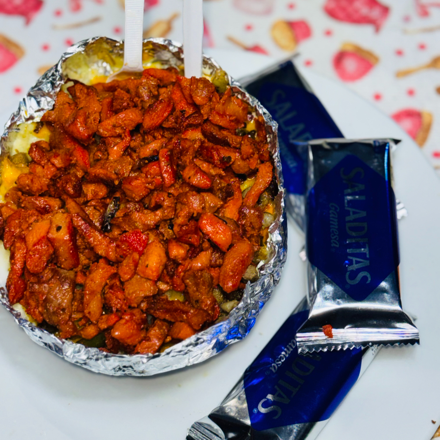 PAPA ASADA GRANDE AL CARBON CON PASTOR BISTEK Y ALAMBRE PARA DOS PERSONAS INCLUYE MANTEQUILLA CREMA QUESO AMARILLO GRATINADO GALLETAS SALADAS SALSAS VERDE Y ROJA